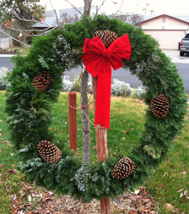 Giant wreath, measures 4 feet.  Primarily composed of noble fir.  Wreath contains yellow incense cedar, juniper berries, pine cones, and a red bow.